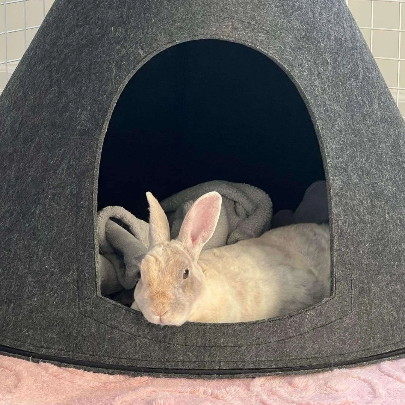 She doesn’t like being confined so she needs a large, bunny proofed area with toys and hiding spots. She would also greatly benefit from having a bunny friend to help her mellow out and learn the joys of being a house bunny.