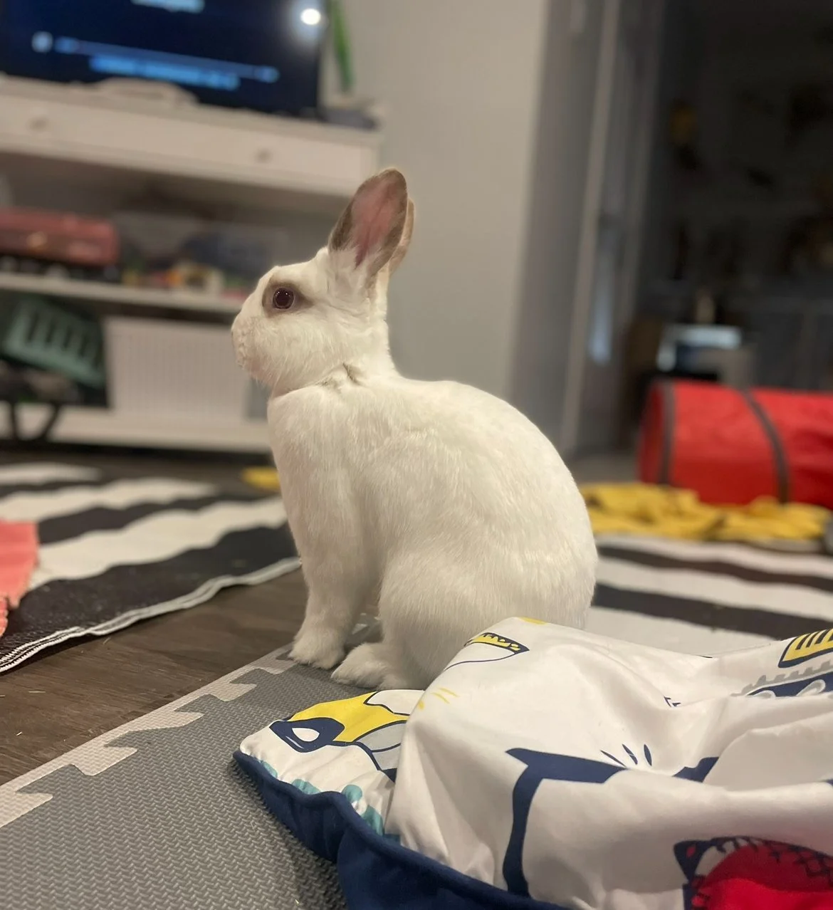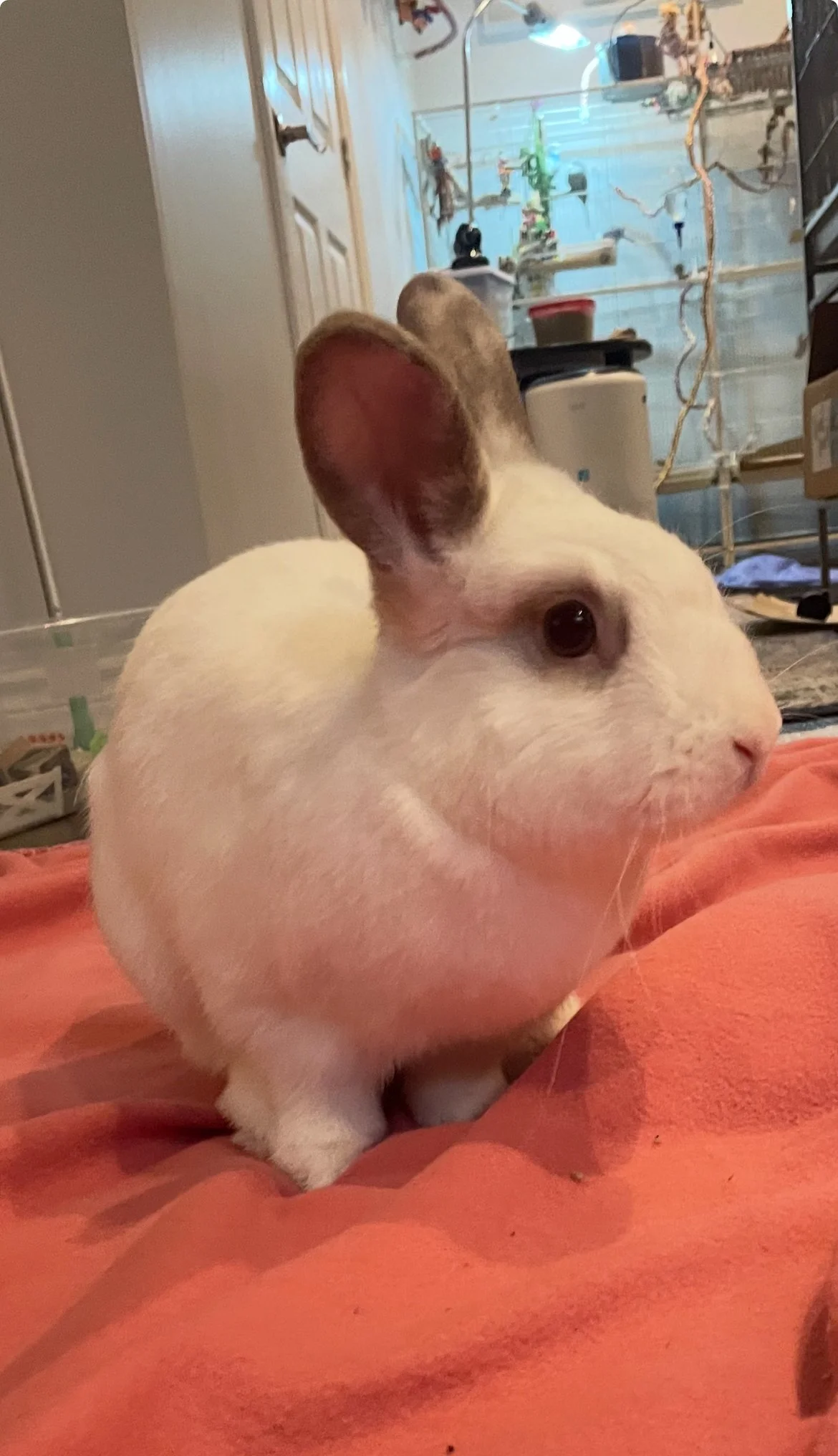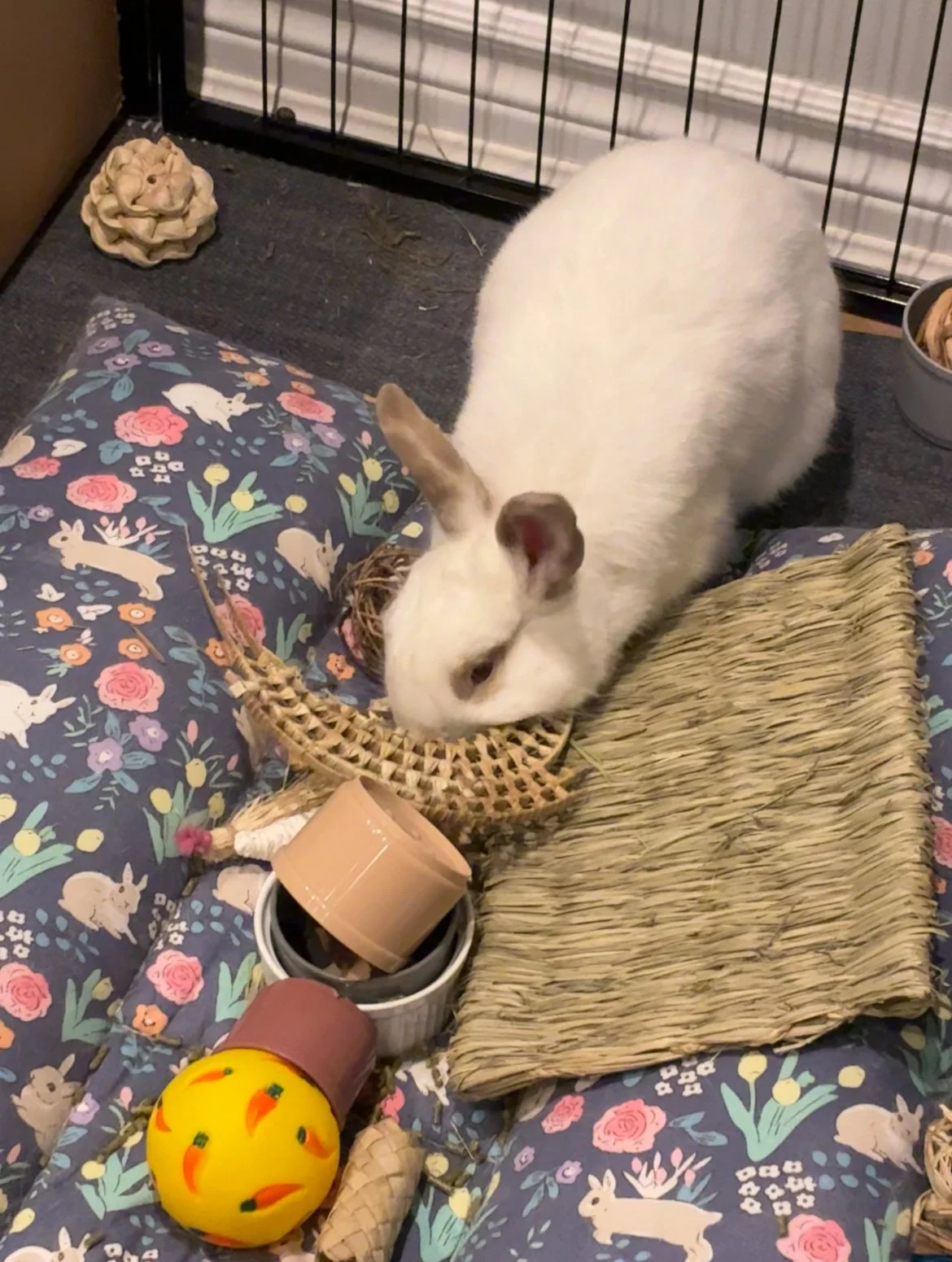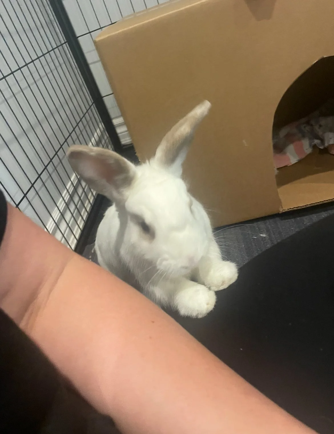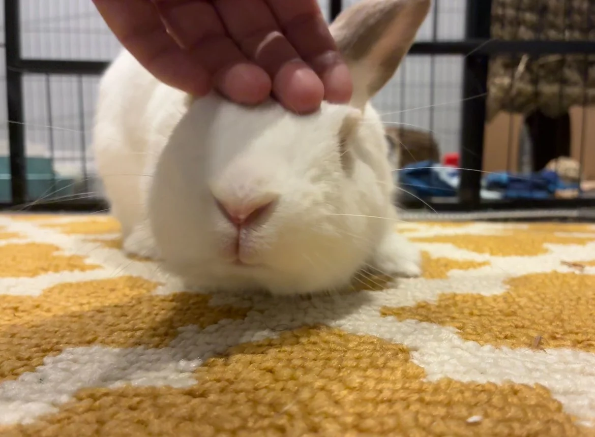 Mojito is a friendly and social bun who has lots of energy! He needs a lot of exercise and doesn't like being confined (he pushes and challenges fence lines), so he'd do well as a free roam bun or with a large area/room. He loves to run around and tire himself out for a bit and then he'll hop up and lay beside his foster mom for pets - he's even started giving her kisses! He's not destructive - he doesn't destroy carpets or blankets or dig at the litter box (wires would just need to be protected as usual with most buns!), and his litter habits are 95% (just a few stray poops out of the box). We suspect he'd rather have lots of human attention over another rabbit - an ideal home for him would be where he could be in a high traffic area of the house and get lots of attention from the family. It's possible he might like a chill lady bun who's very submissive as Mojito would definitely like to be the one in charge. Overall he's a very sweet rabbit with lots of personality and is sure to bring lots of joy to whomever adopts him!